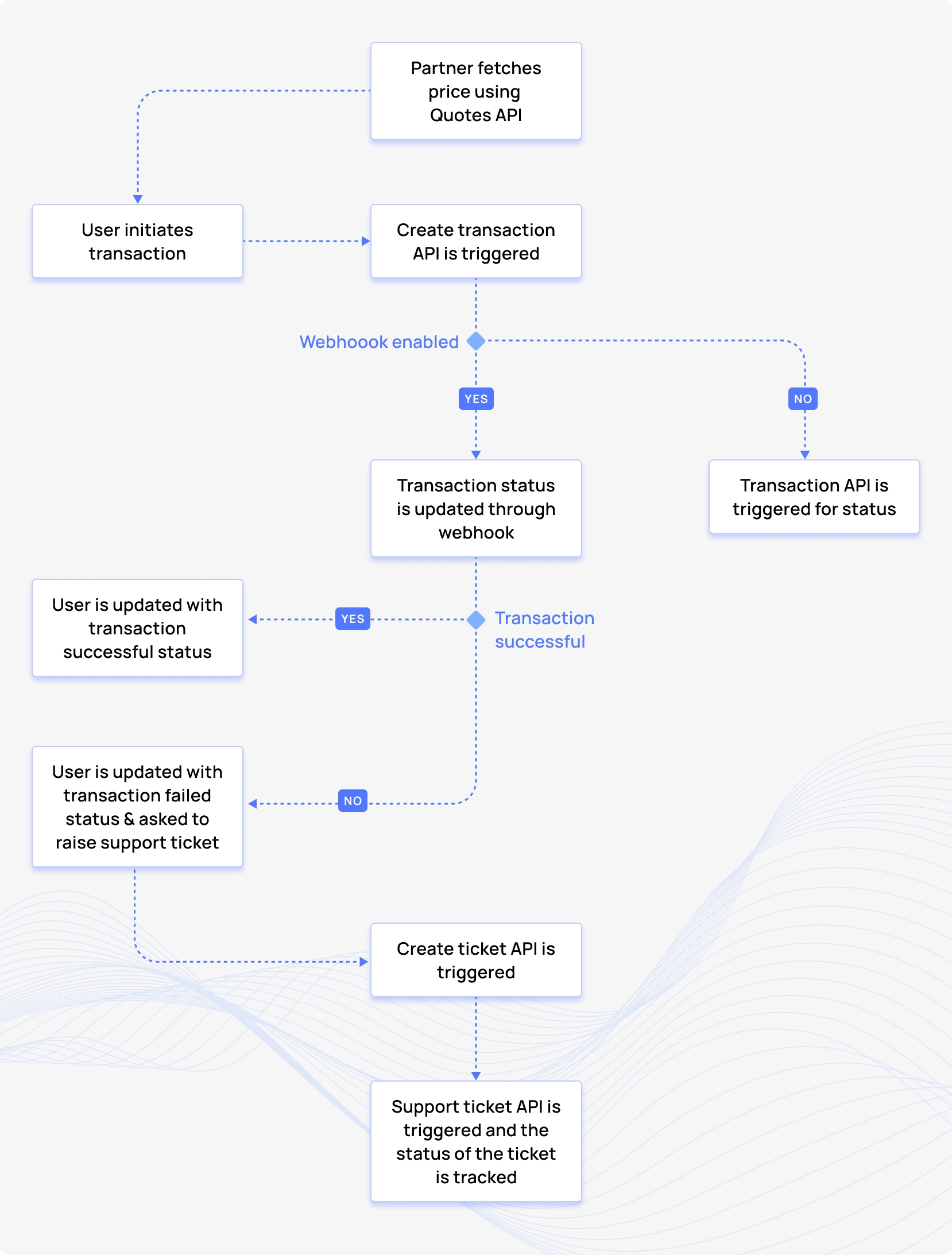 1. Fetch Price: To initiate the transaction process, partners first use the Quotes API to retrieve the current cryptocurrency price. This step is crucial as it ensures that users are presented with the most up-to-date pricing information before they proceed with their transaction. This API call fetches real-time data, reflecting the volatile nature of cryptocurrency prices. For more information refer to -> Quote.